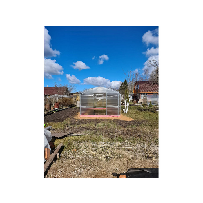 Возможна самостоятельная сборка по подробной инструкции. Сборка теплицы монтажниками-профессионалами компании занимает порядка 3 часов. В качестве основания рекомендуется использовать бетонный, либо деревянный фундамент из бруса. Предварительно брус необходимо обработать антисептиком. Полный комплект состоит из: